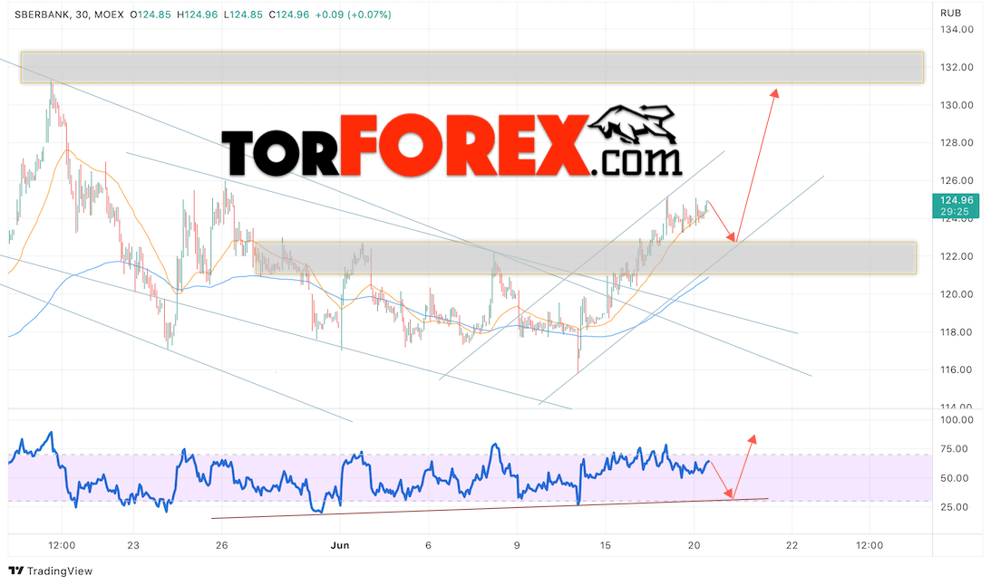 В пользу роста котировок SBER выступит тест линии поддержки на индикаторе относительной силы. Вторым сигналом выступит отскок от нижней границы бычьего канала. Отменой варианта роста стоимости акций Сбербанк станет падение и пробой уровня 120. Это укажет на пробой области поддержки и продолжение падения в область ниже уровня 95. Ожидать подтверждения подъёма котировок SBER стоит с пробоем области сопротивления и закрытием выше уровня 125.