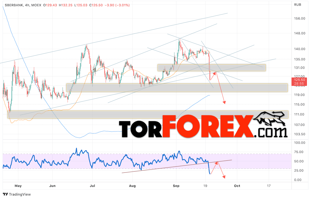 Дополнительным сигналом в пользу снижения котировок SBER выступит тест пробитой линии тренда на индикаторе относительной силы (RSI). Вторым сигналом выступит отскок от нижней границы бычьего канала. Отменой варианта снижения стоимости акций Сбербанк станет сильный рост и пробой уровня 135. Это укажет на пробой области сопротивления и продолжение роста в область выше уровня 160. Ожидать подтверждения падению котировок SBER стоит с пробоем области поддержки и закрытием ниже уровня 120.