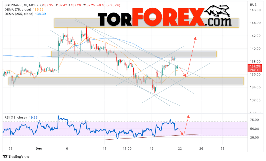 Котировки акций Сбербанк торгуется на уровне 137. Бумага продолжает движение в рамках роста и покинули пределы нисходящего канала. Скользящие средние указывают на наличие медвежьей тенденции по акциям компании. Цены вновь тестируют область между сигнальными линиями, что указывает на давление со стороны продавцов бумаг и потенциальное продолжение падения цены акций уже с текущих уровней. В рамках прогноза курса и стоимости Сбербанк на 22 декабря 2022 стоит ожидать попытку развития коррекции и тест уровня поддержки вблизи области 135. Откуда стоит ожидать отскок вверх и продолжения роста курса акций Сбербанк с целью выше уровня 142.