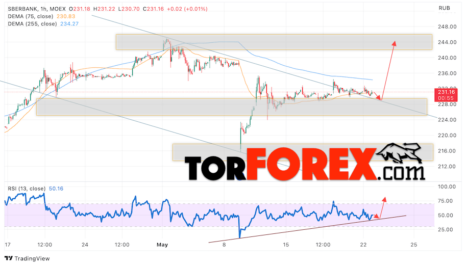 Дополнительным сигналом в пользу роста котировок SBER выступит тест линии тренда на индикаторе относительной силы (RSI). Вторым сигналом выступит отбой от верхней границы нисходящего канала, который был пробит покупателями вверх. Отменой варианта роста стоимости акций Сбербанк станет падение и пробой уровня 225. Это укажет на пробой области поддержки и продолжение падения в область ниже уровня 205. Ожидать подтверждения росту котировок SBER стоит с пробоем области сопротивления и закрытием выше уровня 235.