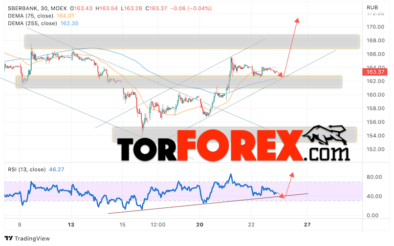 Дополнительным сигналом в пользу роста котировок SBER выступит тест линии тренда на индикаторе относительной силы (RSI). Вторым сигналом выступит отбой от нижней границы бычьего канала. Отменой варианта роста стоимости акций Сбербанк станет падение и пробой уровня 158. Это укажет на пробой области поддержки и продолжение падения в область ниже уровня 145. Ожидать подтверждения росту котировок SBER стоит с пробоем области сопротивления и закрытием выше уровня 165.