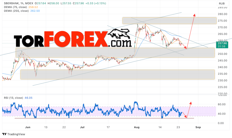 Таким образом, Акции Сбербанк прогноз на 25 августа 2023 предполагает попытку развития медвежьей коррекции и области поддержки вблизи уровня 255. Далее, продолжение роста котировок SBER с целью выше уровня 280. Отменой варианта роста цены акций Сбербанк на завтра выступит падение ценных бумаг и пробой уровня 250. В этом случае стоит ожидать продолжения падения стоимости актива к уровню 235.