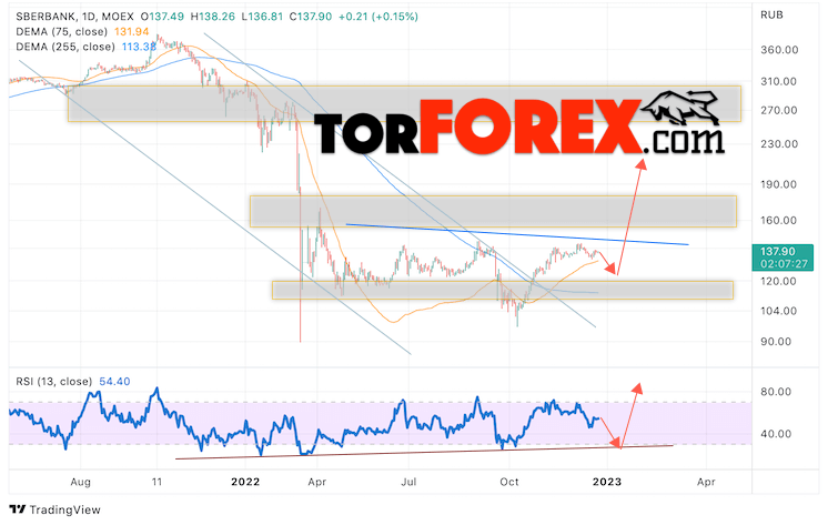 Котировки акций Сбербанк завершают торговую неделю вблизи области 137.90. Бумага продолжает движение в рамках роста и формирования разворотной модели ”Голова и плечи”. Скользящие средние указывают на наличие бычьей тенденции по акциям компании. Цены пробили область между сигнальными линиями вверх, что указывает на давление со стороны покупателей актива и потенциальное продолжение роста уже с текущих уровней. В рамках прогноза курса и стоимости Сбербанк на текущей торговой неделе 26 — 30 декабря 2022 стоит ожидать попытку развития коррекции и тест уровня поддержки вблизи области 120.65. Откуда стоит ожидать отскок вверх и попытку продолжения роста курса акций Сбербанк с целью выше уровня 205.05.