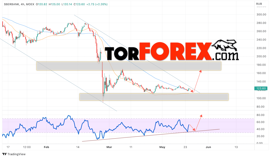 В пользу роста котировок SBER выступит тест бычьей линии тренда на индикаторе относительной силы. Вторым сигналом выступит отскок от нижней гардины разворотной модели ”Двойное дно”. Отменой варианта роста стоимости акций Сбербанк станет падение и пробой уровня 100. Это укажет на пробой области поддержки и продолжение падения в область ниже уровня 85. Ожидать подтверждения подъёма котировок SBER стоит с пробоем области сопротивления и закрытием выше уровня 135.