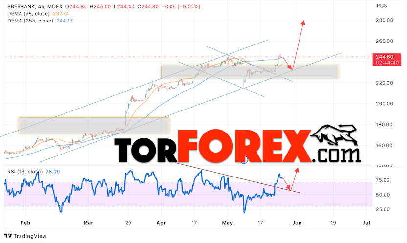 Дополнительным сигналом в пользу роста котировок SBER выступит тест линии тренда на индикаторе относительной силы (RSI). Вторым сигналом выступит отбой от нижней границы бычьего канала. Отменой варианта роста стоимости акций Сбербанк станет падение и пробой уровня 220. Это укажет на пробой области поддержки и продолжение падения в область ниже уровня 195. Ожидать подтверждения росту котировок SBER стоит с пробоем области сопротивления и закрытием выше уровня 255.