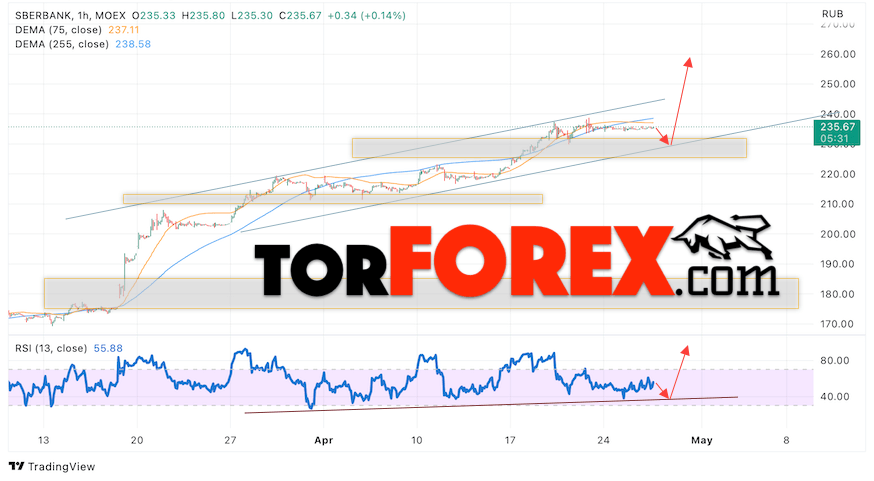 Дополнительным сигналом в пользу роста котировок SBER выступит тест линии тренда на индикаторе относительной силы (RSI). Вторым сигналом выступит отбой от нижней границы бычьего канала. Отменой варианта роста стоимости акций Сбербанк станет падение и пробой уровня 225. Это укажет на пробой области поддержки и продолжение падения в область ниже уровня 185. Ожидать подтверждения росту котировок SBER стоит с пробоем области сопротивления и закрытием выше уровня 245, что укажет на пробой верхней границы бычьего канала.