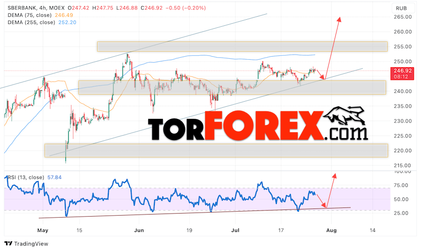 Дополнительным сигналом в пользу роста котировок SBER выступит тест линии поддержки на индикаторе относительной силы (RSI). Вторым сигналом выступит отбой от нижней границы бычьего канала. Отменой варианта роста стоимости акций Сбербанк станет падение стоимости бумаг и пробой уровня 240. Это укажет на пробой нижней границы бычьего канала и продолжение падения акций в область ниже уровня 225. Ожидать подтверждения росту котировок SBER стоит с пробоем области сопротивления и закрытием выше уровня 255.