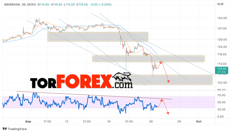 Таким образом, Акции Сбербанк прогноз на 27 сентября 2022 предполагает попытку теста области сопротивления вблизи уровня 115. Далее, продолжение падения котировок SBER с целью ниже уровня 100. Отменой варианта снижения цены акций Сбербанк выступит сильный рост и пробой уровня 125. В этом случае стоит ожидать продолжения подъёма к уровню 145.