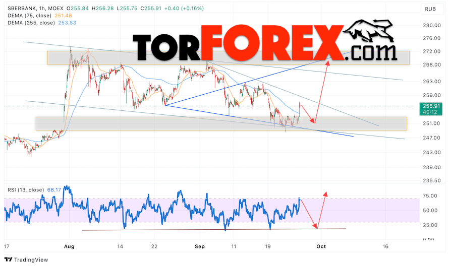 Таким образом, Акции Сбербанк прогноз на 27 сентября 2023 предполагает попытку развития медвежьей коррекции и области поддержки вблизи уровня 250. Далее, продолжение роста котировок SBER с целью выше уровня 270. Отменой варианта роста цены акций Сбербанк на завтра выступит падение ценных бумаг и пробой уровня 245. В этом случае стоит ожидать продолжения падения стоимости актива к уровню 230.