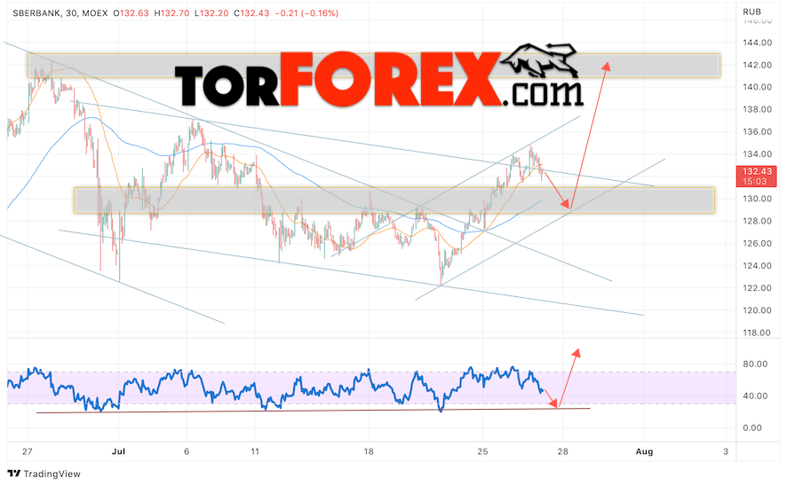 Таким образом, Акции Сбербанк прогноз на 28 июля 2022 предполагает попытку теста области поддержки вблизи уровня 129. Далее, продолжение роста котировок SBER с целью выше уровня 140. Отменой варианта роста цены акций Сбербанк выступит падение и пробой уровня 125. В этом случае стоит ожидать продолжения снижения к уровню 105.
