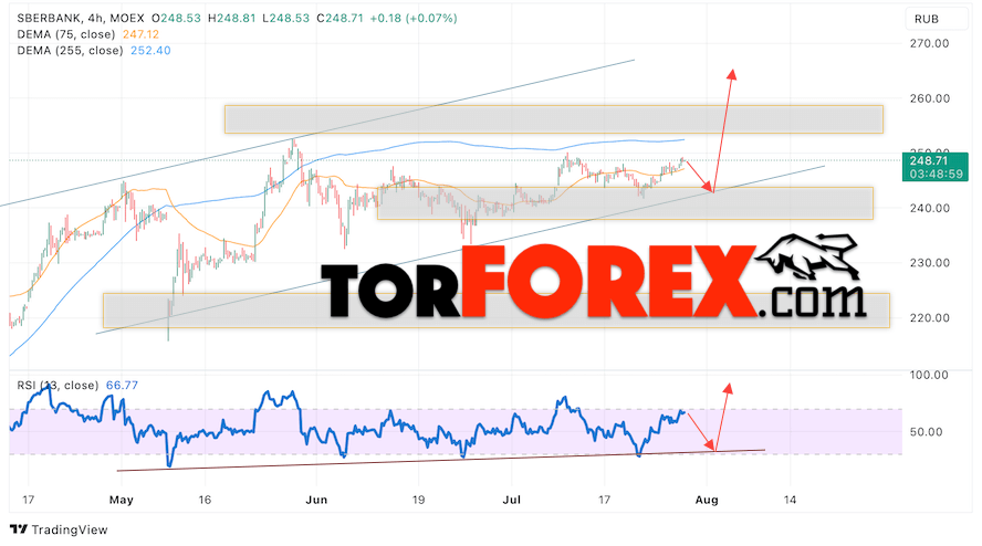 Дополнительным сигналом в пользу роста котировок SBER выступит тест линии поддержки на индикаторе относительной силы (RSI). Вторым сигналом выступит отбой от нижней границы бычьего канала. Отменой варианта роста стоимости акций Сбербанк станет падение стоимости бумаг и пробой уровня 240. Это укажет на пробой нижней границы бычьего канала и продолжение падения акций в область ниже уровня 225. Ожидать подтверждения росту котировок SBER стоит с пробоем области сопротивления и закрытием выше уровня 255.