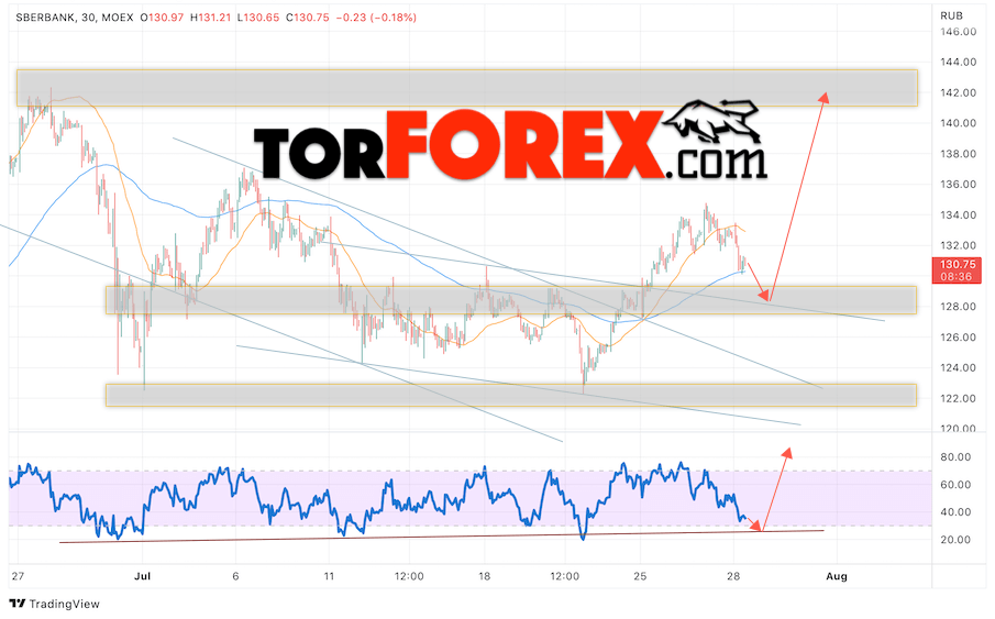 Таким образом, Акции Сбербанк прогноз на 29 июля 2022 предполагает попытку теста области поддержки вблизи уровня 128. Далее, продолжение роста котировок SBER с целью выше уровня 140. Отменой варианта роста цены акций Сбербанк выступит падение и пробой уровня 125. В этом случае стоит ожидать продолжения снижения к уровню 105.
