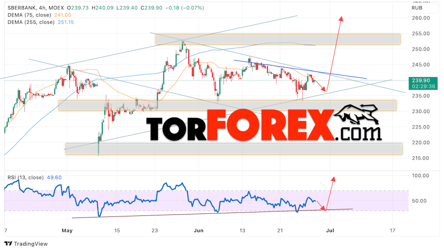 Таким образом, Акции Сбербанк прогноз на 29 июня 2023 предполагает попытку теста снижения и области поддержки вблизи уровня 237. Далее, продолжение роста котировок SBER с целью выше уровня 260. Отменой варианта роста цены акций Сбербанк на завтра выступит падение ценных бумаг и пробой уровня 230. В этом случае стоит ожидать продолжения падения стоимости актива к уровню 215.