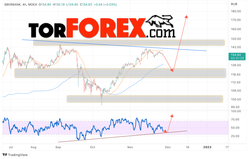 Дополнительным сигналом в пользу подъёма котировок SBER выступит тест пробитой линии тренда на индикаторе относительной силы (RSI). Вторым сигналом выступит отбой от нижней границы разворотной модели ”Голова и плечи”. Отменой варианта роста стоимости акций Сбербанк станет падение и пробой уровня 105. Это укажет на пробой области поддержки и продолжение падения в область ниже уровня 75. Ожидать подтверждения росту котировок SBER стоит с пробоем области сопротивления и закрытием выше уровня 150, что укажет на пробой верхней границы разворотной модели ”Голова и плечи” и начало отработки паттерну с целями вверху.