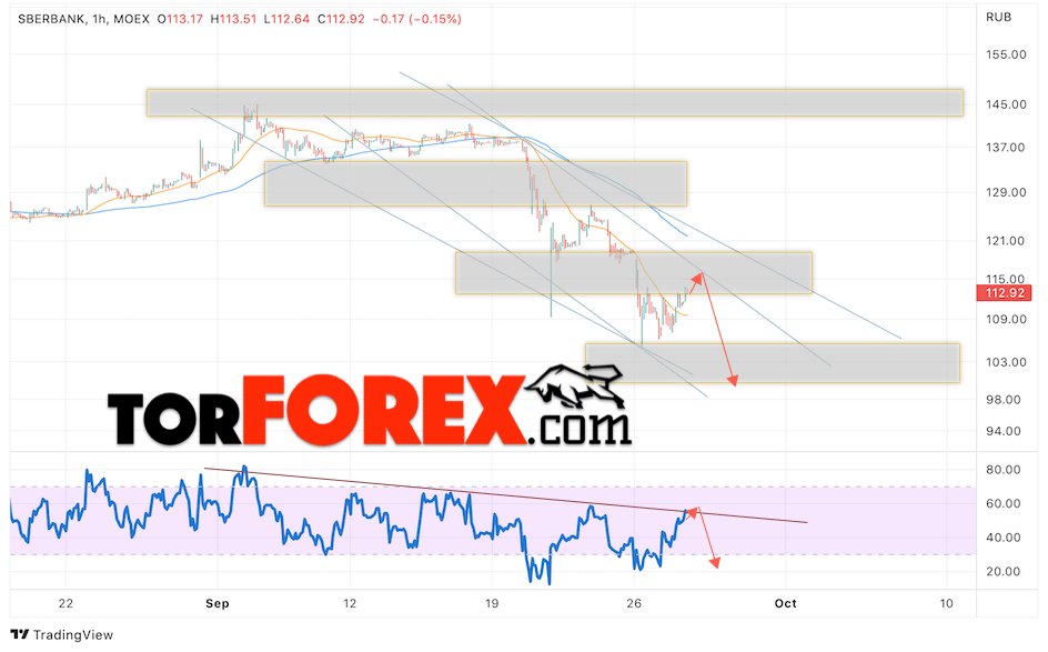 Таким образом, Акции Сбербанк прогноз на 29 сентября 2022 предполагает попытку теста области сопротивления вблизи уровня 115. Далее, продолжение падения котировок SBER с целью ниже уровня 98. Отменой варианта снижения цены акций Сбербанк выступит сильный рост и пробой уровня 125. В этом случае стоит ожидать продолжения подъёма к уровню 145.