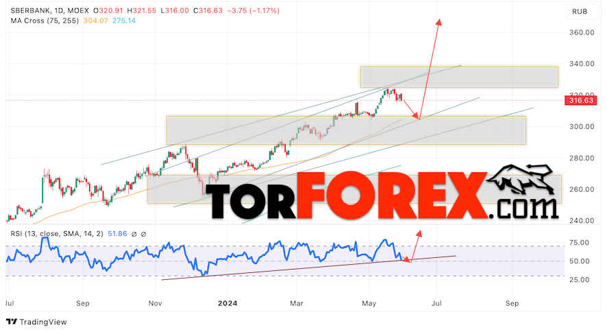 Таким образом, Акции Сбербанк прогноз на 3 — 7 июня 2024 предполагает попытку теста области поддержки вблизи уровня 310. Далее, продолжение роста котировок SBER с целью выше уровня 365. Отменой варианта подъёма цены акций Сбербанк выступит падение и пробой уровня 290. Это укажет на пробой нижней границы бычьего канала. В этом случае стоит ожидать продолжения снижения к уровню 245.