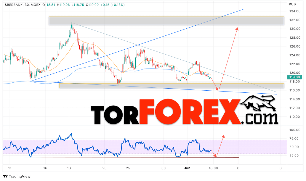 В пользу роста котировок SBER выступит тест линии поддержки на индикаторе относительной силы. Вторым сигналом выступит отскок от нижней границы бычьей модели ”Волна Вульфа”. Отменой варианта роста стоимости акций Сбербанк станет падение и пробой уровня 110. Это укажет на пробой области поддержки и продолжение падения в область ниже уровня 85. Ожидать подтверждения подъёма котировок SBER стоит с пробоем области сопротивления и закрытием выше уровня 122, что укажет на пробой верхней градины модели ”Волна Вульфа”.