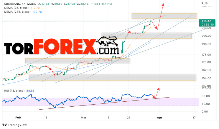 Дополнительным сигналом в пользу роста котировок SBER выступит тест линии тренда на индикаторе относительной силы (RSI). Вторым сигналом выступит отбой от нижней границы бычьего канала. Отменой варианта роста стоимости акций Сбербанк станет падение и пробой уровня 190. Это укажет на пробой области поддержки и продолжение падения в область ниже уровня 165. Ожидать подтверждения росту котировок SBER стоит с пробоем области сопротивления и закрытием выше уровня 225, что укажет на пробой верхней границы бычьего канала.