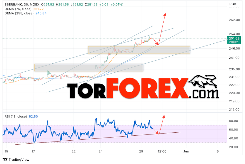 Дополнительным сигналом в пользу роста котировок SBER выступит тест линии тренда на индикаторе относительной силы (RSI). Вторым сигналом выступит отбой от нижней границы бычьего канала. Отменой варианта роста стоимости акций Сбербанк станет падение и пробой уровня 245. Это укажет на пробой области поддержки и продолжение падения в область ниже уровня 215. Ожидать подтверждения росту котировок SBER стоит с пробоем области сопротивления и закрытием выше уровня 265, что укажет на пробой верхней границы бычьего канала, а это сигнал к росту на ширину канала.