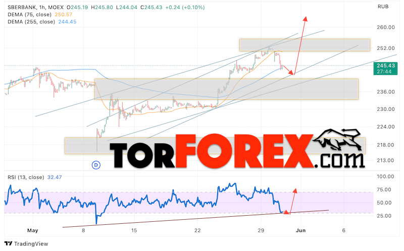 Дополнительным сигналом в пользу роста котировок SBER выступит тест линии тренда на индикаторе относительной силы (RSI). Вторым сигналом выступит отбой от нижней границы бычьего канала. Отменой варианта роста стоимости акций Сбербанк станет падение и пробой уровня 235. Это укажет на пробой области поддержки и продолжение падения в область ниже уровня 215. Ожидать подтверждения росту котировок SBER стоит с пробоем области сопротивления и закрытием выше уровня 250.