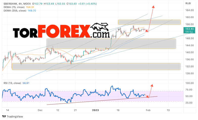 Таким образом, Акции Сбербанк прогноз на 31 января 2023 предполагает попытку теста снижения и области поддержки вблизи уровня 151. Далее, продолжение роста котировок SBER с целью выше уровня 165. Отменой варианта подъёма цены акций Сбербанк на завтра выступит падение и пробой уровня 148. В этом случае стоит ожидать продолжения снижения стоимости к уровню 135.
