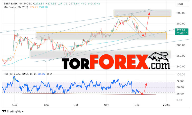 Таким образом, Акции Сбербанк прогноз на 5 декабря 2023 предполагает попытку развития медвежьей коррекции и области поддержки вблизи уровня 270. Далее, продолжение роста котировок SBER с целью выше уровня 290. Отменой варианта подъёма цены акций Сбербанк на завтра выступит падение ценных бумаг и пробой уровня 265. В этом случае стоит ожидать продолжения снижения стоимости актива к уровню 225.