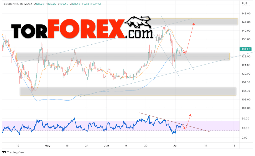 В пользу роста котировок SBER выступит тест линии поддержки на индикаторе относительной силы (RSI). Вторым сигналом выступит отскок от верхней границы нисходящего канала. Отменой варианта роста стоимости акций Сбербанк станет падение и пробой уровня 120. Это укажет на пробой области поддержки и продолжение падения в область ниже уровня 95. Ожидать подтверждения подъёма котировок SBER стоит с пробоем области сопротивления и закрытием выше уровня 135.