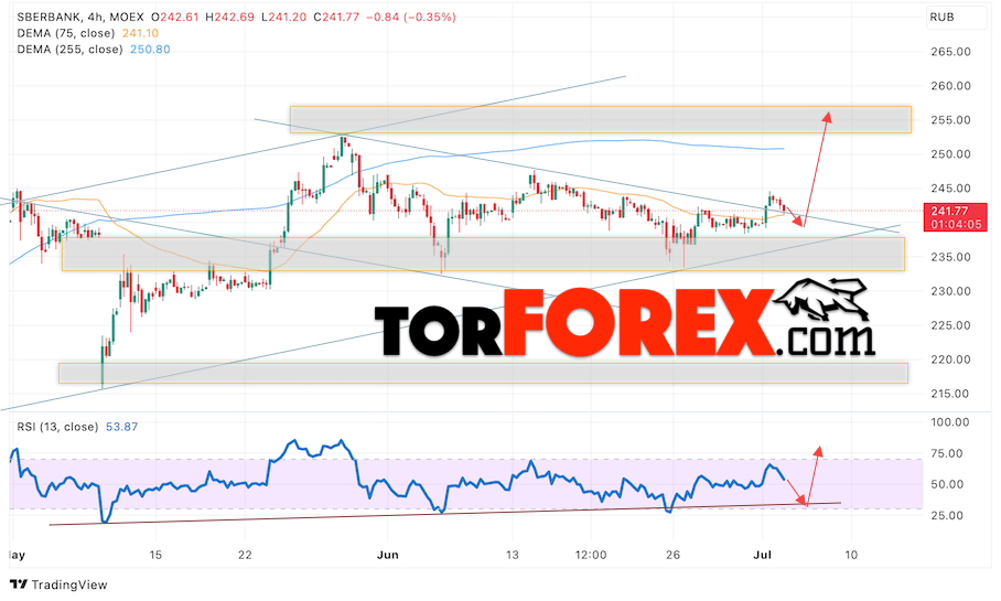 Таким образом, Акции Сбербанк прогноз на 5 июля 2023 предполагает попытку теста снижения и области поддержки вблизи уровня 238. Далее, продолжение роста котировок SBER с целью выше уровня 255. Отменой варианта роста цены акций Сбербанк на завтра выступит падение ценных бумаг и пробой уровня 234. В этом случае стоит ожидать продолжения падения стоимости актива к уровню 225.