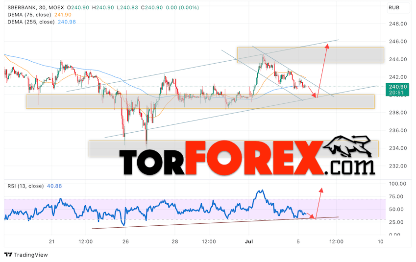 Таким образом, Акции Сбербанк прогноз на 6 июля 2023 предполагает попытку теста снижения и области поддержки вблизи уровня 239. Далее, продолжение роста котировок SBER с целью выше уровня 245. Отменой варианта роста цены акций Сбербанк на завтра выступит падение ценных бумаг и пробой уровня 234. В этом случае стоит ожидать продолжения падения стоимости актива к уровню 225.