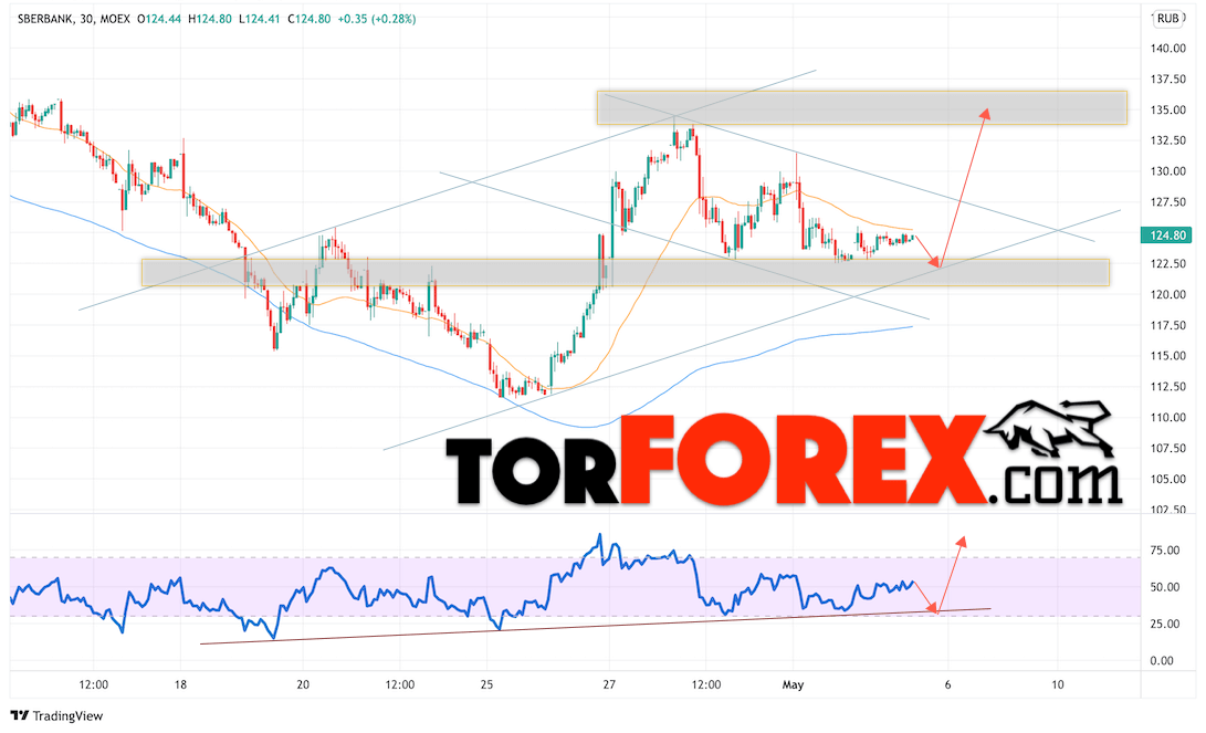 В пользу подъёма котировок SBER выступит тест пробитой линии тренда на индикаторе относительной силы. Вторым сигналом выступит отскок от нижней границы бычьего канала. Отменой варианта роста стоимости акций Сбербанк станет падение и пробой уровня 115. Это укажет на пробой области поддержки и продолжение падения в область ниже уровня 90. Ожидать подтверждения подъёма котировок SBER стоит с пробоем области сопротивления и закрытием выше уровня 130, что укажет на пробой верхней границы нисходящего канала.