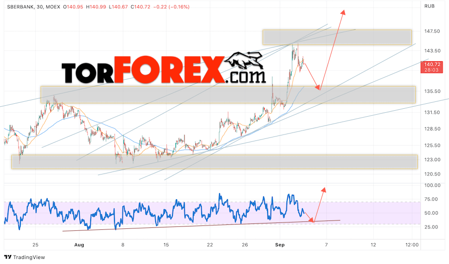 Таким образом, Акции Сбербанк прогноз на 6 сентября 2022 предполагает попытку теста области поддержки вблизи уровня 135. Далее, продолжение роста котировок SBER с целью выше уровня 150. Отменой варианта роста цены акций Сбербанк выступит падение и пробой уровня 130. В этом случае стоит ожидать продолжения снижения к уровню 120.