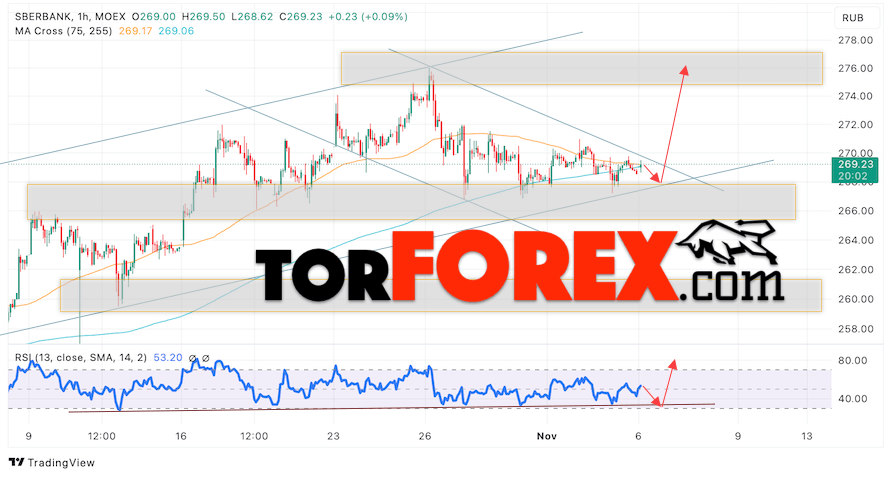 Таким образом, Акции Сбербанк прогноз на 7 ноября 2023 предполагает попытку развития медвежьей коррекции и области поддержки вблизи уровня 265. Далее, продолжение роста котировок SBER с целью выше уровня 275. Отменой варианта роста цены акций Сбербанк на завтра выступит падение ценных бумаг и пробой уровня 265. В этом случае стоит ожидать продолжения падения стоимости актива к уровню 240.