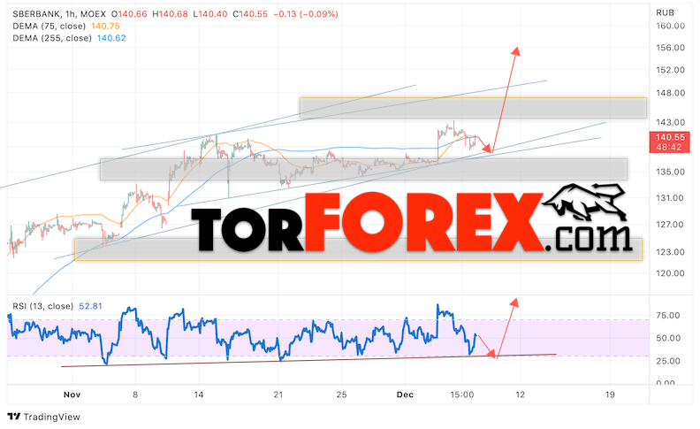 Дополнительным сигналом в пользу подъёма котировок SBER выступит тест бычьей линии тренда на индикаторе относительной силы (RSI). Вторым сигналом выступит отбой от нижней бычьего канала. Отменой варианта роста стоимости акций Сбербанк станет падение и пробой уровня 136. Это укажет на пробой области поддержки и продолжение падения в область ниже уровня 125. Ожидать подтверждения росту котировок SBER стоит с пробоем области сопротивления и закрытием выше уровня 150.