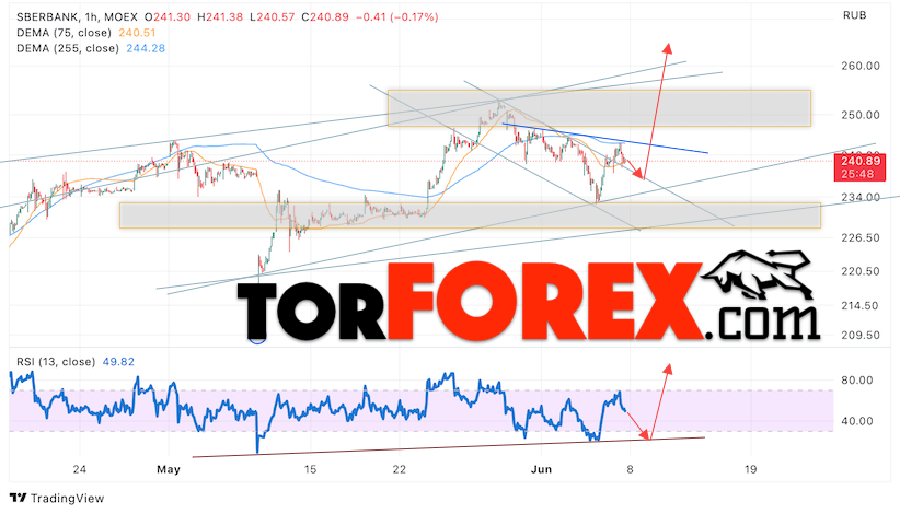 Дополнительным сигналом в пользу роста котировок SBER выступит тест линии тренда на индикаторе относительной силы (RSI). Вторым сигналом выступит отбой от верхней границы медвежьего канала. Отменой варианта роста стоимости акций Сбербанк станет падение и пробой уровня 225. Это укажет на пробой области поддержки и продолжение падения в область ниже уровня 195. Ожидать подтверждения росту котировок SBER стоит с пробоем области сопротивления и закрытием выше уровня 245, что укажет на пробой верхней границы разворотной модели «Голова и плечи» и начало отработки модели с целями вверху.