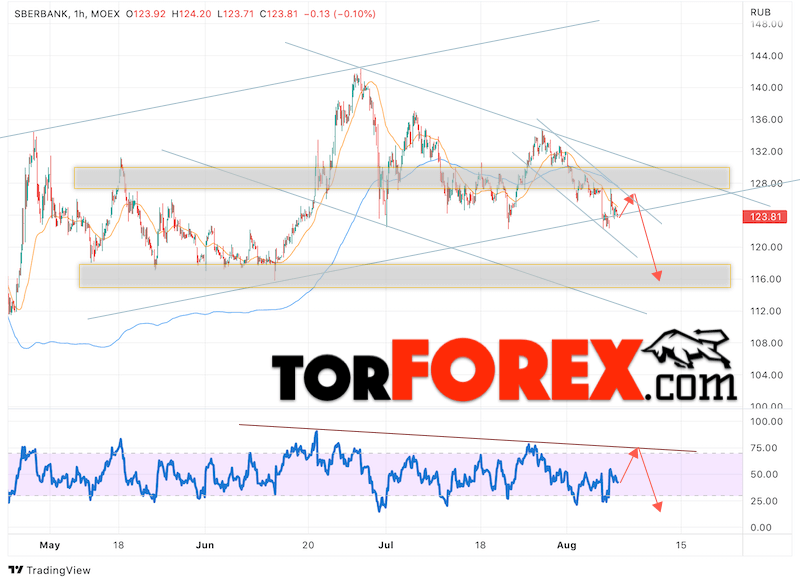 Таким образом, Акции Сбербанк прогноз на 9 августа 2022 предполагает попытку теста области сопротивления вблизи уровня 125. Далее, продолжение падения котировок SBER с целью ниже уровня 115. Отменой варианта падения цены акций Сбербанк выступит сильный рост и пробой уровня 130. В этом случае стоит ожидать продолжения подъёма к уровню 145.