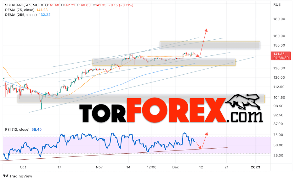 Дополнительным сигналом в пользу подъёма котировок SBER выступит тест бычьей линии тренда на индикаторе относительной силы (RSI). Вторым сигналом выступит отбой от нижней бычьего канала. Отменой варианта роста стоимости акций Сбербанк станет падение и пробой уровня 127. Это укажет на пробой области поддержки и продолжение падения в область ниже уровня 115. Ожидать подтверждения росту котировок SBER стоит с пробоем области сопротивления и закрытием выше уровня 150.