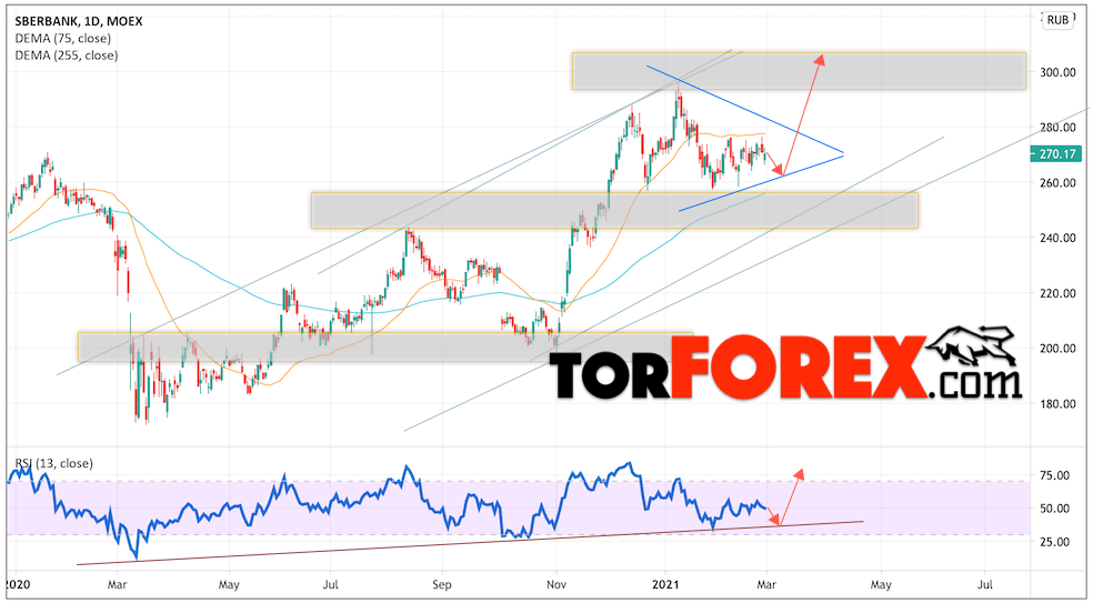 Котировки акций Сбербанк завершают торговую неделю вблизи области 270.17. Бумага продолжает движение в рамках коррекции и формирования модели ”Треугольник”, как правило, такая модель пробивается рынком вверх. Скользящие средние указывают на наличие бычьей тенденции по акциям компании. Цены тестируют область между сигнальными линиями, что указывает на давление со стороны покупателей актива. В рамках прогноза курса и стоимости Сбербанк на текущей торговой неделе 1 — 5 марта 2021 стоит ожидать попытку незначительной коррекции и тест уровня поддержки вблизи области 263.55. Откуда стоит ожидать отскок и продолжения роста курса акций Сбербанк с целью выше уровня 315.00.