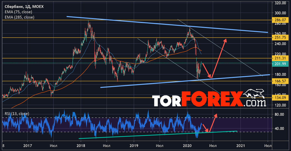 В пользу подъема котировок SBER выступит тест восходящей линии поддержки на индикаторе относительной силы, ранее цены уже отталкивались от этой линии. Вторым сигналом выступит отскок от нижней границы модели «Треугольник». Отменой варианта подъёма стоимости акций Сбербанк на следующей торговой неделе станет падение и пробой уровня 150.00. Это укажет на пробой нижней границы модели «Треугольник» и продолжение снижения в область ниже уровня 120.05. Ожидать подтверждения роста котировок SBER стоит с пробоем области сопротивления и закрытием выше уровня 210.00, что укажет на завершение формирования разворотной модели «Двойное Дно».