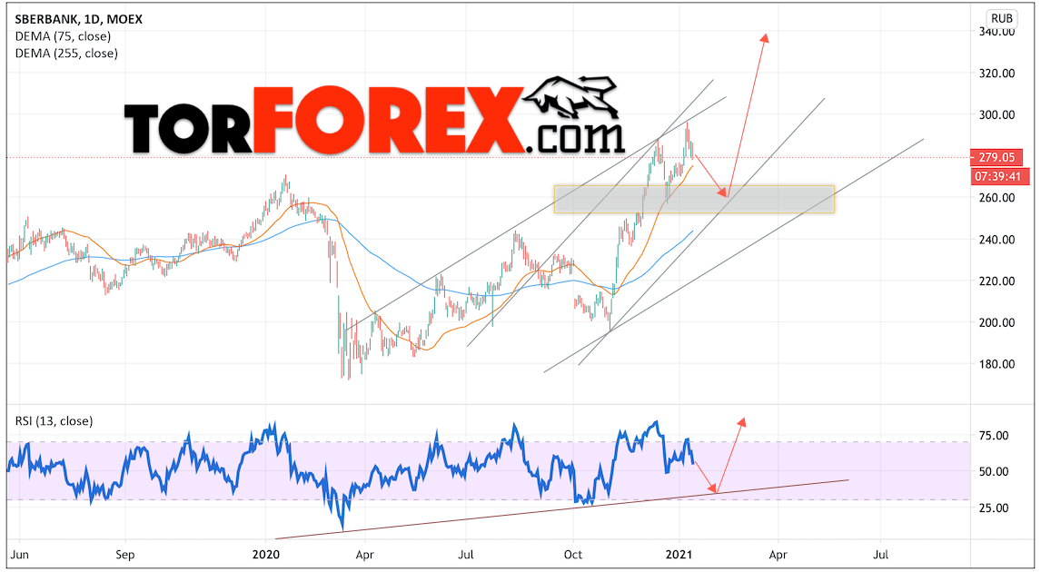 Котировки акций Сбербанк завершают торговую неделю вблизи области 279.05. Бумага продолжает движение в рамках подъёма. Скользящие средние указывают на наличие бычьей тенденции по акциям компании. Цены ушли далеко вверх от сигнальных линий, что указывает на давление со стороны покупателей актива. В рамках прогноза курса и стоимости Сбербанк на текущей торговой неделе 18 — 22 января 2021 стоит ожидать попытку незначительной коррекции и тест уровня поддержки вблизи области 265.00. Откуда стоит ожидать отскок и продолжения роста курса акций Сбербанк с целью выше уровня 340.00.