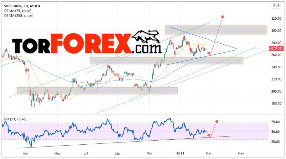 Таким образом, Акции Сбербанк прогноз на неделю 22 — 26 февраля 2021 предполагает попытку теста области поддержки вблизи уровня 260.05. Далее, продолжение роста котировок SBER с целью выше уровня 325.00. Отменой варианта подъёма цены акций Сбербанк выступит падение и пробой уровня 245.00. Это укажет на пробой нижней границы канала. В этом случае стоит ожидать продолжения снижения ниже уровня 225.05.