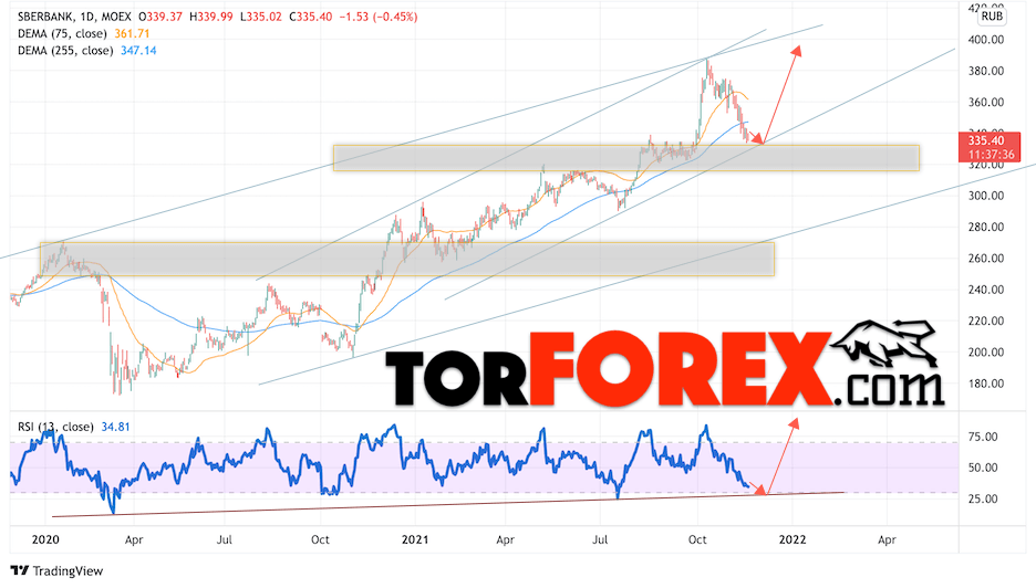 Таким образом, Акции Сбербанк прогноз на 22 — 26 ноября 2021 предполагает попытку теста области поддержки вблизи уровня 320.55. Далее, продолжение роста котировок SBER с целью выше уровня 405.05. Отменой варианта подъёма цены акций Сбербанк выступит падение и пробой уровня 310.55. Это укажет на пробой нижней границы канала. В этом случае стоит ожидать продолжения снижения ниже уровня 275.05.