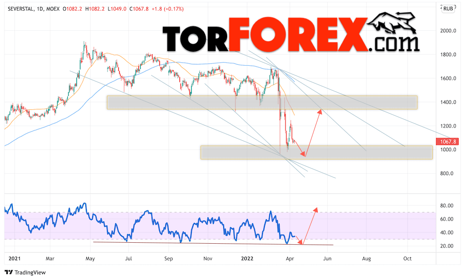 Котировки акций CHMF завершают торговую неделю вблизи области 1067. Бумага продолжает движение в рамках падения и медвежьего канала. Скользящие средние указывают на наличие нисходящей тенденции по акциям компании. Цены пробили область между сигнальными линиями вниз, что указывает на давление со стороны продавцов актива и продолжение падения. В рамках прогноза курса и стоимости Северсталь на текущей торговой неделе 11 — 15 апреля 2022 стоит ожидать попытку падения и тест уровня поддержки вблизи области 950. Откуда стоит рассматривать отскок и начала роста курса акций Северсталь с целью выше уровня 1285.
