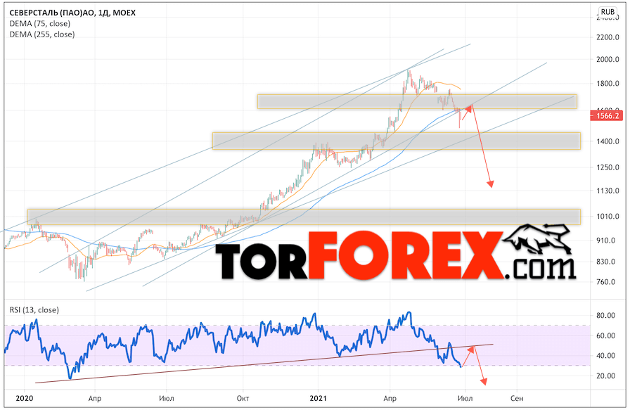 В пользу снижения котировок CHMF выступит тест пробитой линии тренда на индикаторе относительной силы. Вторым сигналом выступит отскок от нижней границы восходящего канала. Отменой варианта падения стоимости акций Северсталь на следующей торговой неделе станет сильный рост и пробой уровня 1805. Это укажет на пробой области сопротивления и продолжение подъёма в область выше уровня 2005. Ожидать подтверждения падения котировок CHMF стоит с пробоем области поддержки и закрытием ниже уровня 1395.