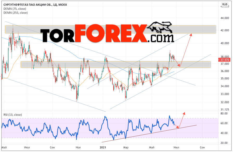 Таким образом, Акции Сургутнефтегаз прогноз на 28 июня — 2 июля 2021 предполагает попытку теста области поддержки вблизи уровня 36.55. Далее, продолжение роста котировок SNGS с целью выше уровня 41.05. Отменой варианта подъёма цены акций Сургутнефтегаз выступит падение и пробой уровня 34.55. Это укажет на пробой нижней границы канала. В этом случае стоит ожидать продолжения снижения ниже уровня 30.05.