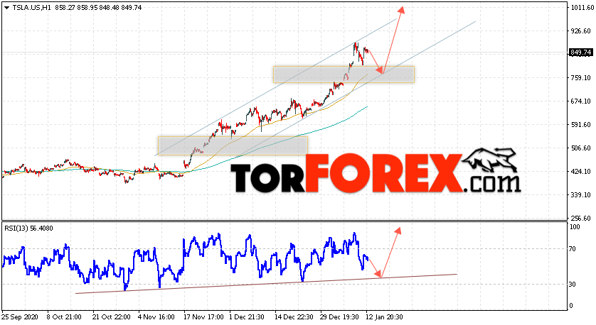 Дополнительным сигналом в пользу роста котировок Tesla выступит тест линии поддержки на индикаторе относительной силы (RSI). Вторым сигналом станет отскок от нижней границы восходящего канала. Отменой варианта роста котировок стоимости акций компании Tesla станет падение и пробой уровня 705.00. Это укажет на пробой области поддержки и продолжение падения в область на уровне 595.05. Ожидать ускорения роста акций стоит с пробоем области сопротивления и закрытием выше уровня 895.05.