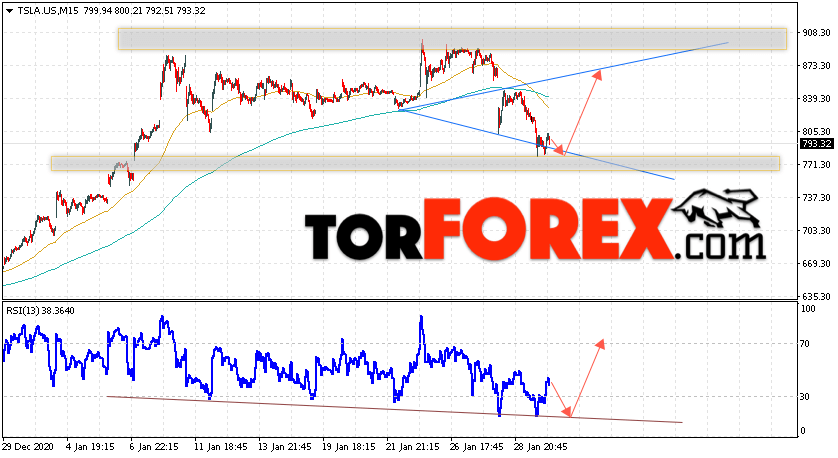 Таким образом, Акции Tesla прогноз и график на 2 февраля 2021 предполагает развитие коррекции и тест области поддержки вблизи уровня 775.05. Откуда стоит ожидать отскок и попытку продолжения роста пары в область выше уровня 865.55. В пользу подъёма валютной пары выступит тест линии тренда на индикаторе относительной силы. Отменой варианта роста Tesla станет падение и пробой уровня 735.00. Это укажет на пробой поддержки и продолжение падения стоимости в область ниже уровня 645.05.