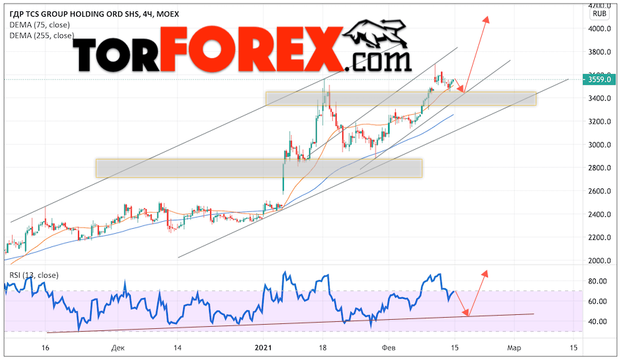 Котировки акций TCS завершают торговую неделю вблизи области 3559.0. Бумага продолжает движение в рамках роста и восходящего канала. Скользящие средние указывают на наличие бычьей тенденции по акциям компании. Цены тестируют область между сигнальными линиями, что указывает на давление со стороны покупателей актива и потенциальное продолжение подъёма. В рамках прогноза курса и стоимости Тинькофф Банк на текущей торговой неделе 15 — 19 февраля 2021 стоит ожидать попытку падения и тест уровня поддержки вблизи области 3575.0. Откуда стоит рассматривать отскок и начало роста курса акций с целью выше уровня 4155.0.