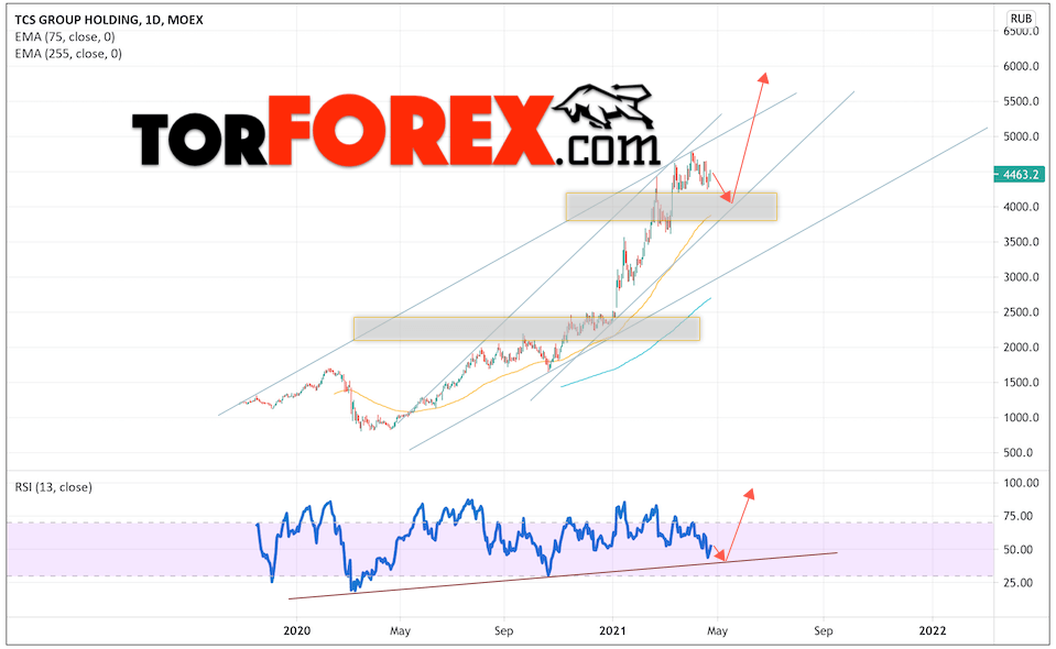 Таким образом, Акции Тинькофф Банк прогноз на 26 — 30 апреля 2021 предполагает попытку теста области поддержки вблизи уровня 4045.0. Далее, продолжение роста котировок TCS с целью выше уровня 6000.5. Отменой варианта подъёма цены акций выступит падение и пробой уровня 3655.0. Это укажет на пробой нижней границы восходящего канала. В этом случае стоит ожидать продолжения падения ниже уровня 3055.0.