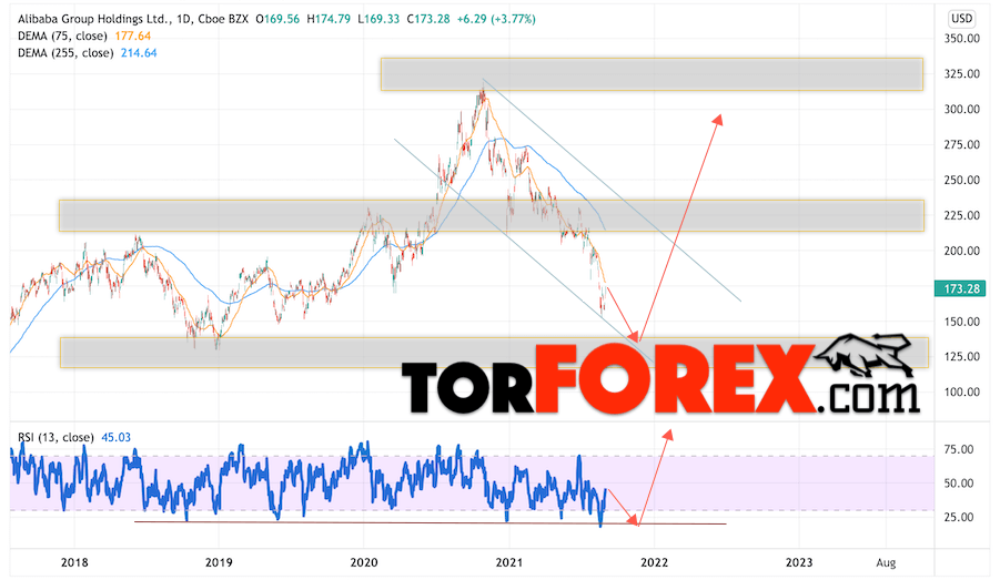 Дополнительным сигналом в пользу роста котировок Alibaba Group выступит тест линии тренда на индикаторе относительной силы (RSI). Вторым сигналом станет отскок от области поддержки. Отменой варианта подъёма котировок стоимости акций компании Alibaba Group станет падение и пробой уровня 105.05. Это укажет на пробой важной области поддержки, в этом случае можно рассматривать продолжение снижения бумаг в область на уровне 75.00. Ожидать подтверждения подъёма акций стоит с пробоем области сопротивления и закрытием выше уровня 205.05, что укажет на выход цен за пределы нисходящего канала.