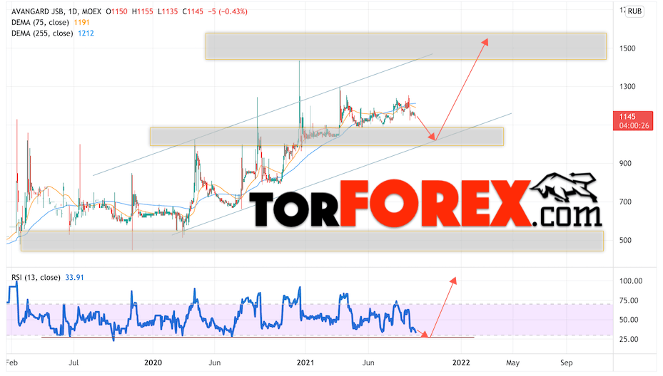 Дополнительным сигналом в пользу подъёма котировок Банк Авангард выступит тест линии поддержки на индикаторе относительной силы (RSI). Вторым сигналом станет отскок от нижней границы долгосрочного бычьего канала. Отменой варианта роста котировок стоимости акций компании Банк Авангард станет падение и пробой уровня 905. Это укажет на пробой области поддержки и продолжение падения в область на уровне 505. Ожидать ускорения подъёма акций стоит с пробоем области сопротивления и закрытием выше уровня 1305, как видим, эту область покупатели пока не смогли пробить.